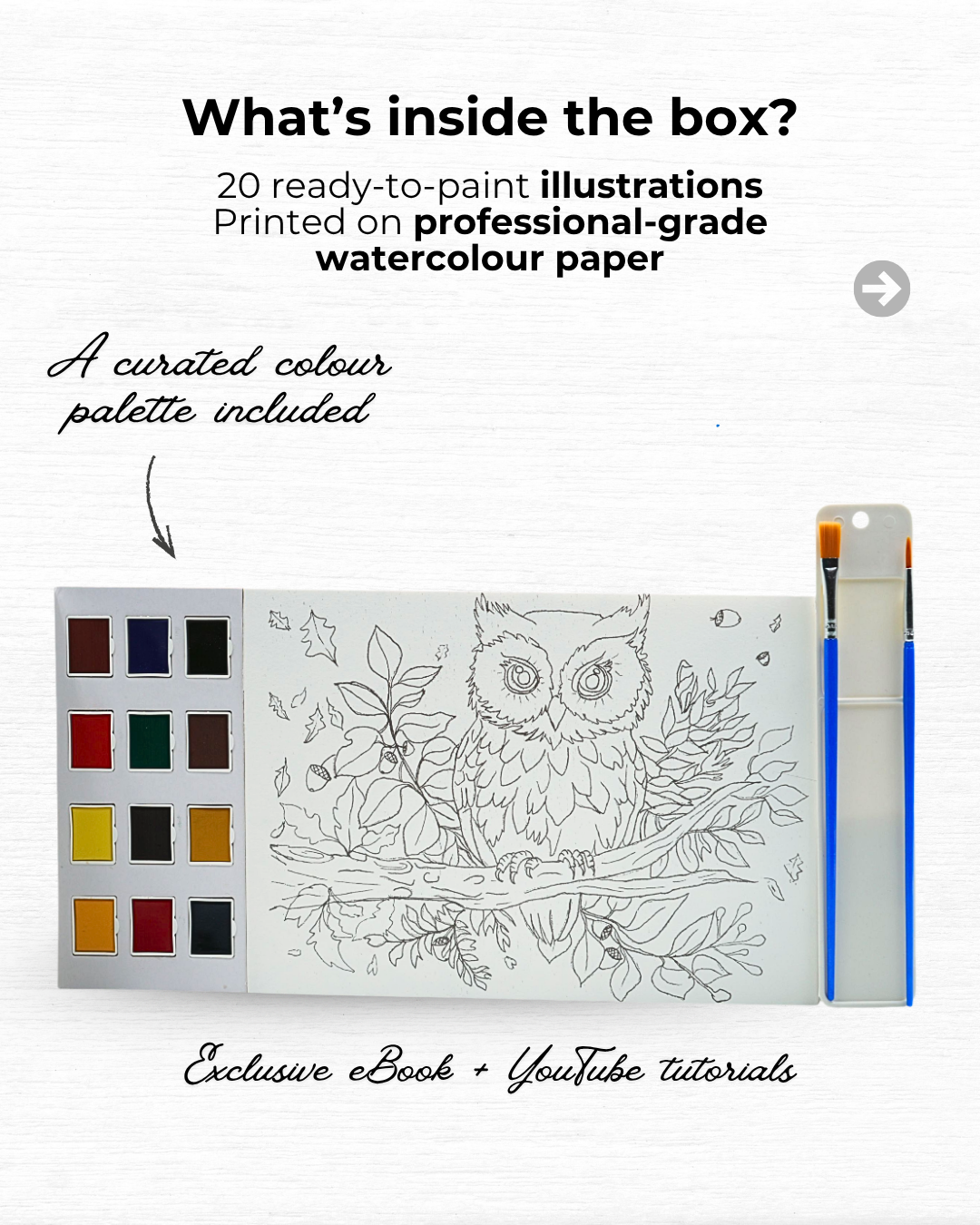 - Ready-to-paint illustrations printed on professional-grade watercolour paper.