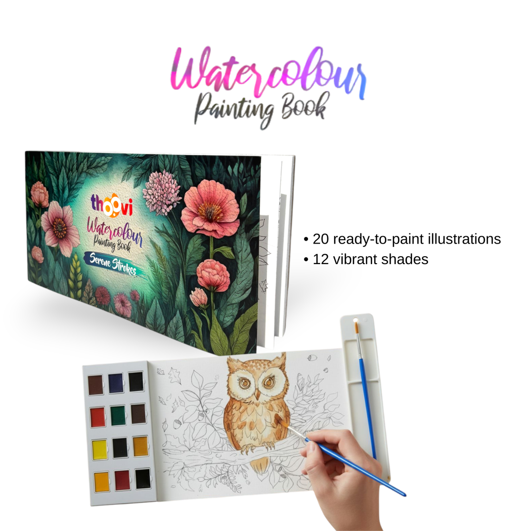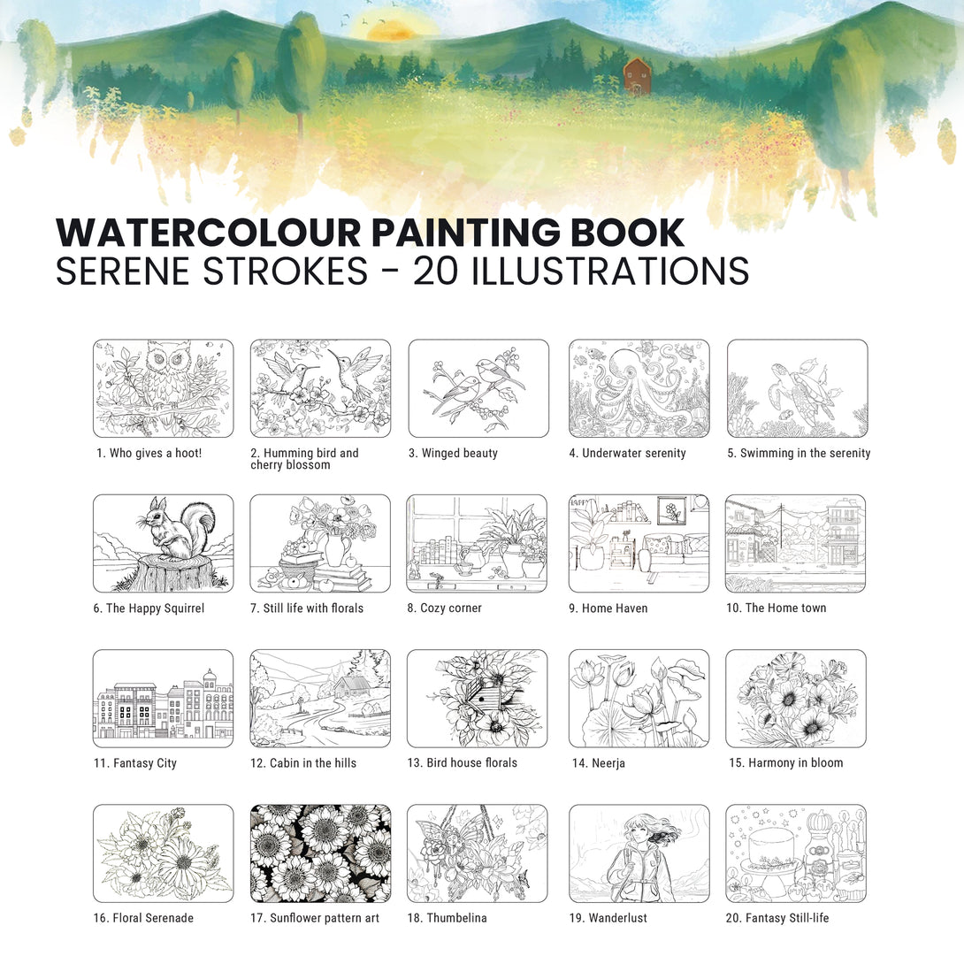 A premium watercolour painting book featuring 20 captivating ready-to-paint illustrations, designed to help you paint with confidence and joy.