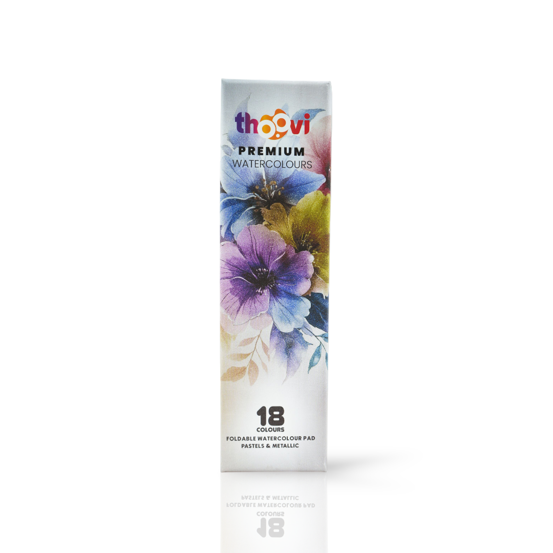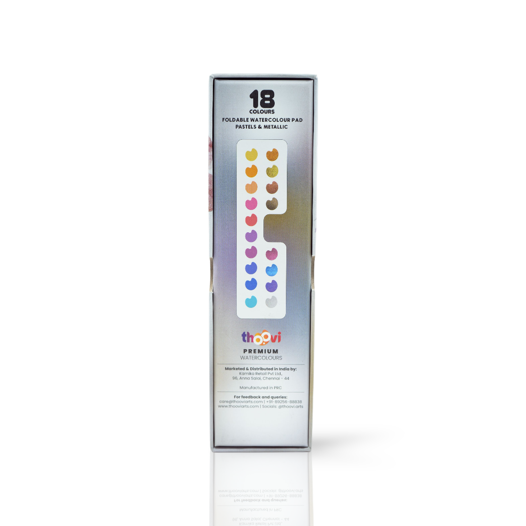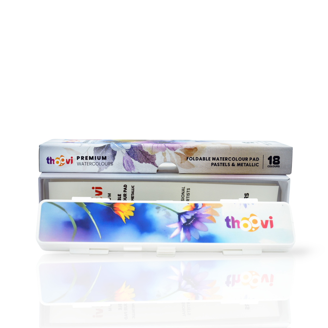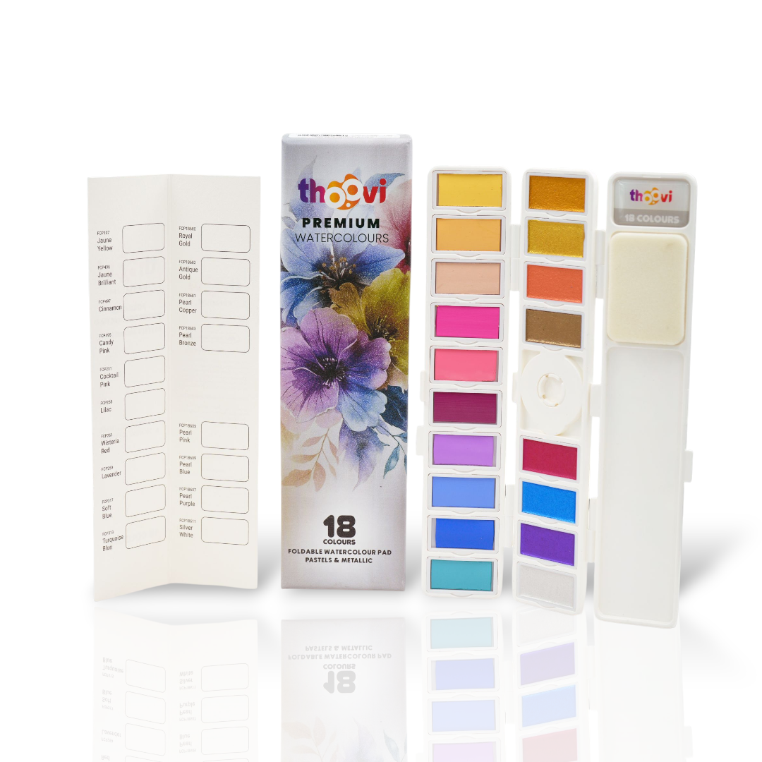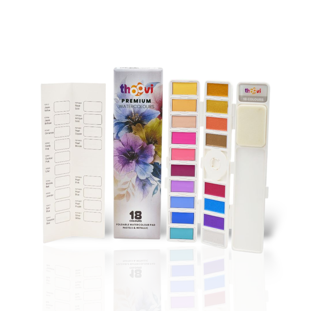 A professional-grade watercolour set designed for both professionals and hobby artists who love colour variety, portability, and elegance. This foldable pad combines pastel and metallic shades in one sleek, ready-to-travel palette.