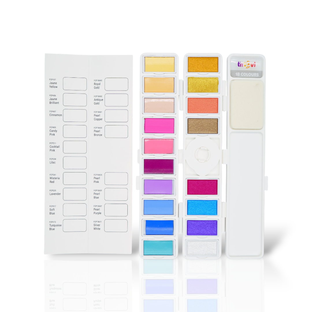- 18 half pans of pastel and metallic watercolours (approx. 2.5 ml each)