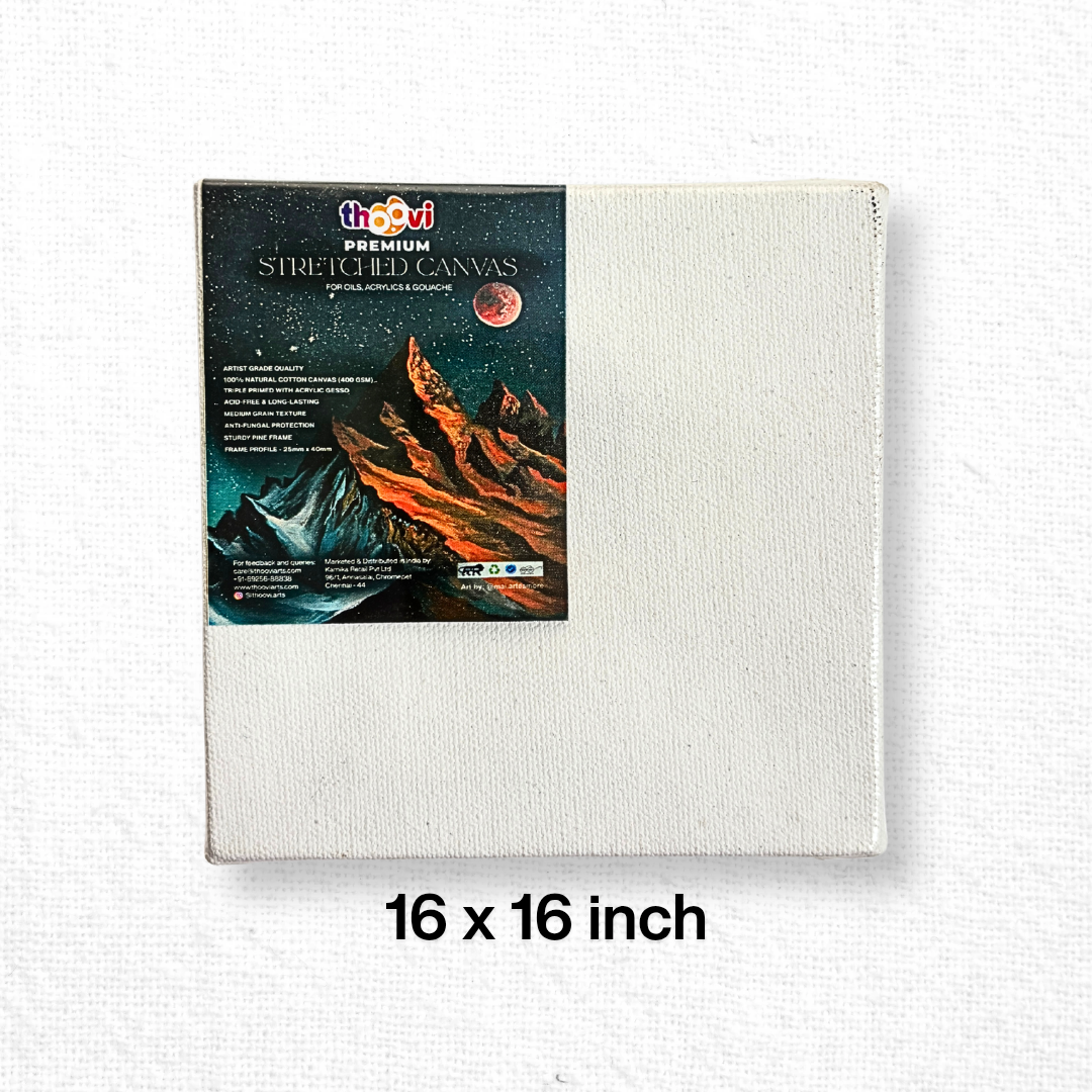 Thoovi – Premium – White Stretched Canvas for Painting I Suitable for Acrylic Paints, Oil Paints & Gouache Paints – 16 x 16 inch (Single pc)